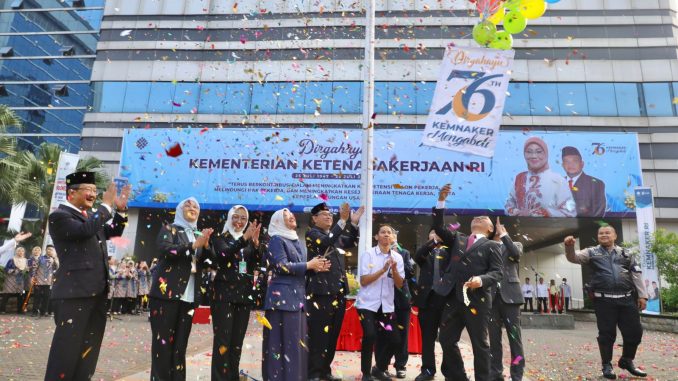 JAKARTA, SP – Menteri Ketenagakerjaan Ida Fauziyah bersama seluruh jajarannya merayakan upacara peringatan HUT ke-76 Kemnaker di halaman kantor Kemnaker, Jalan Gatot Subroto Kavling 51, Jakarta, Selasa (25/7/2023). Ia berharap momentum HUT Kemnaker ke-76 menjadi pijakan untuk terus memperbaiki kinerja, baik di tingkat individu maupun organisasi untuk melayani masyarakat dalam bidang ketenagakerjaan.
