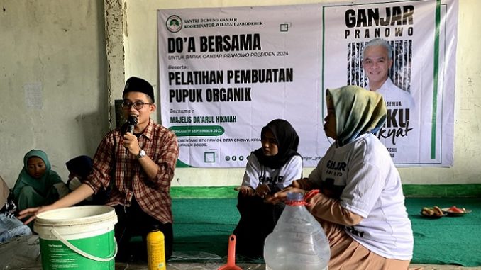 BOGOR, SP – Sukarelawan Santri Dukung Ganjar (SDG) menggelar pelatihan membuat pupuk organik dari sampah rumah tangga bersama masyarakat di Desa Cihowe, Kecamatan Ciseeng, Kabupaten Bogor, Jawa Barat.